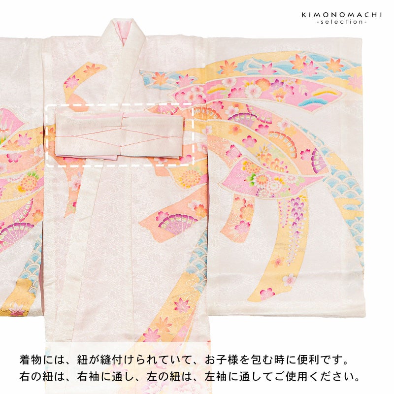着物には紐が縫い付けられていて、お子様を包む時に便利です。右の紐は右袖に通し、左の紐は左袖に通してご使用ください。