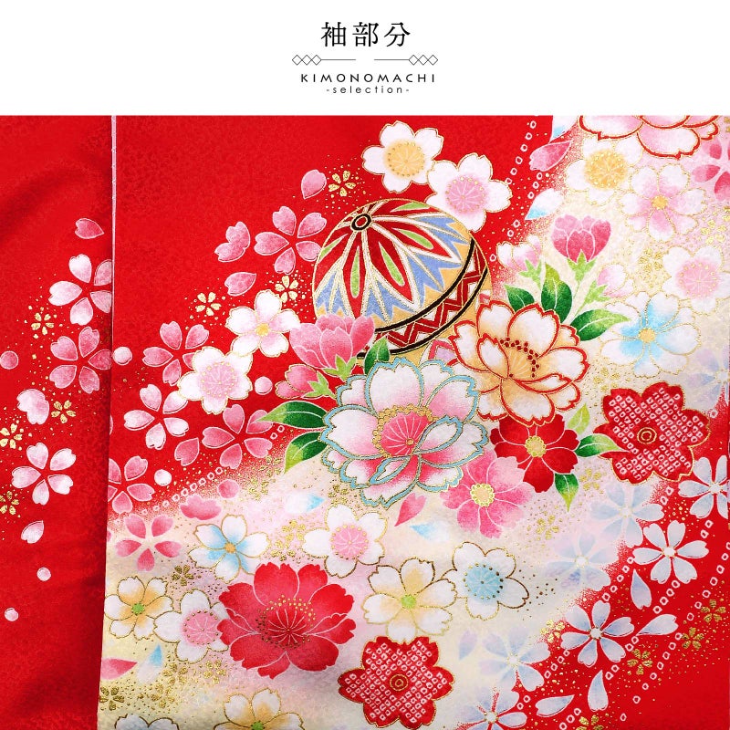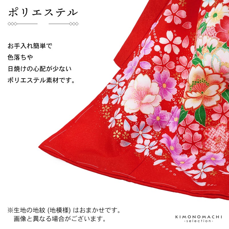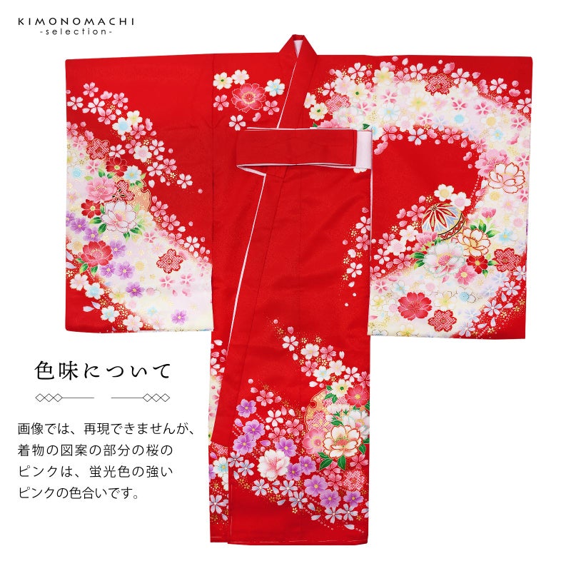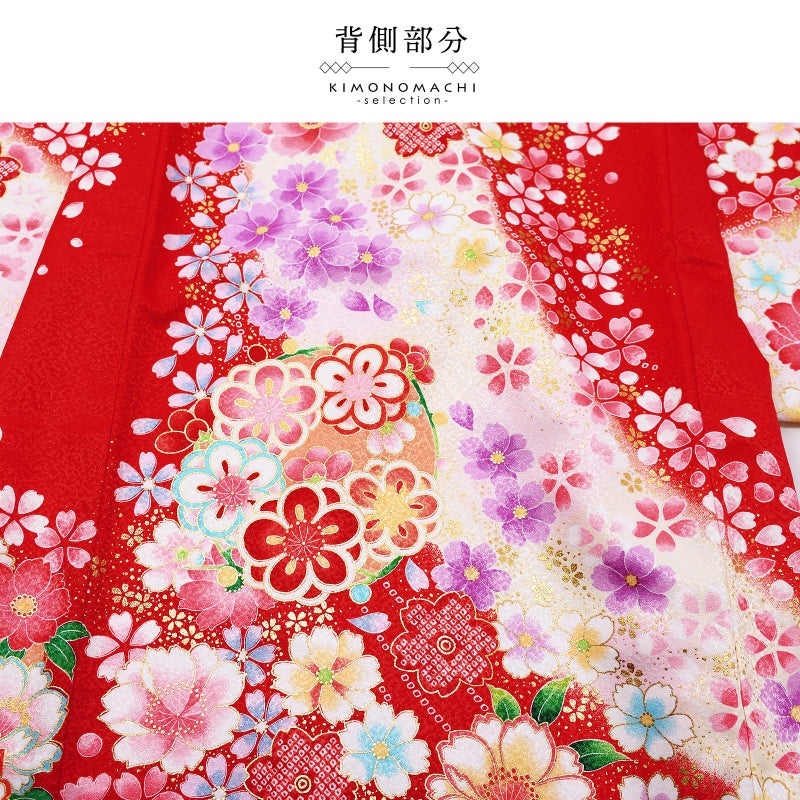 高級感がありつつも、女の子らしく可愛らしい雰囲気。美しい発色の生地に美しい模様。長襦袢の中に赤色の振りが入っており、華やかさをプラスしてくれます。細部に至るまで、こだわったお品です。