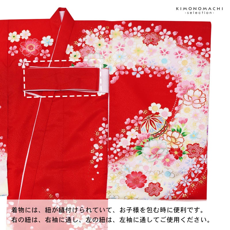 着物には紐が縫い付けられていて、お子様を包む時に便利です。右の紐は右袖に通し、左の紐は左袖に通してご使用ください。