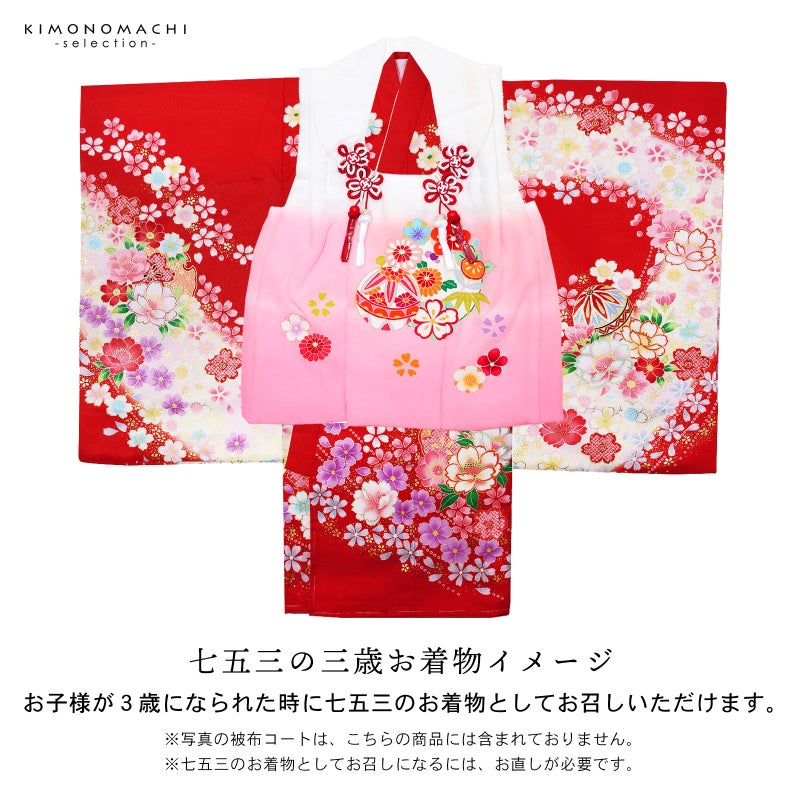 また、お子様が3歳になられた時に七五三のお着物としてもお召しいただけます。お直しが必要になりますので、別途お申込みください。