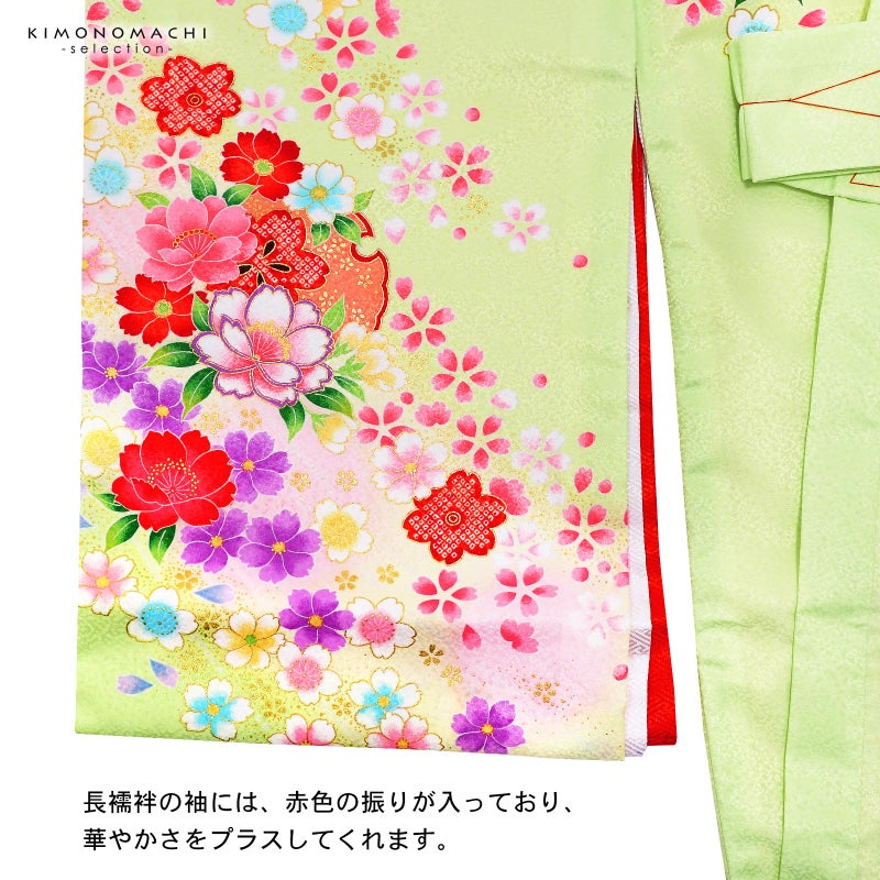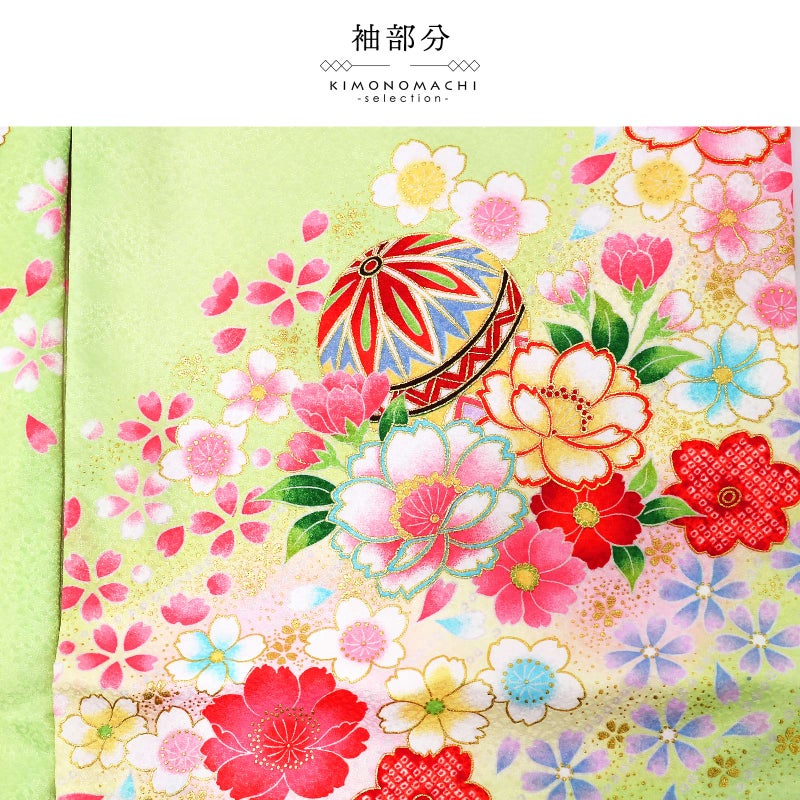 【色柄】ややグレイッシュな明るい黄緑色の地に淡い黄色、ピンクのぼかし。背には赤に黄色や黒、水色、コーラルピンクなどの配色の鞠。赤や薄ピンクの八重桜。黄色や赤、ピンクなどの鞠に牡丹や桜などの花々が全体に流れるように表現されています。ポイントの刺繍や金彩が豪華さと煌びやかさを添えます。襦袢は薄ピンク。袖の振りは赤。