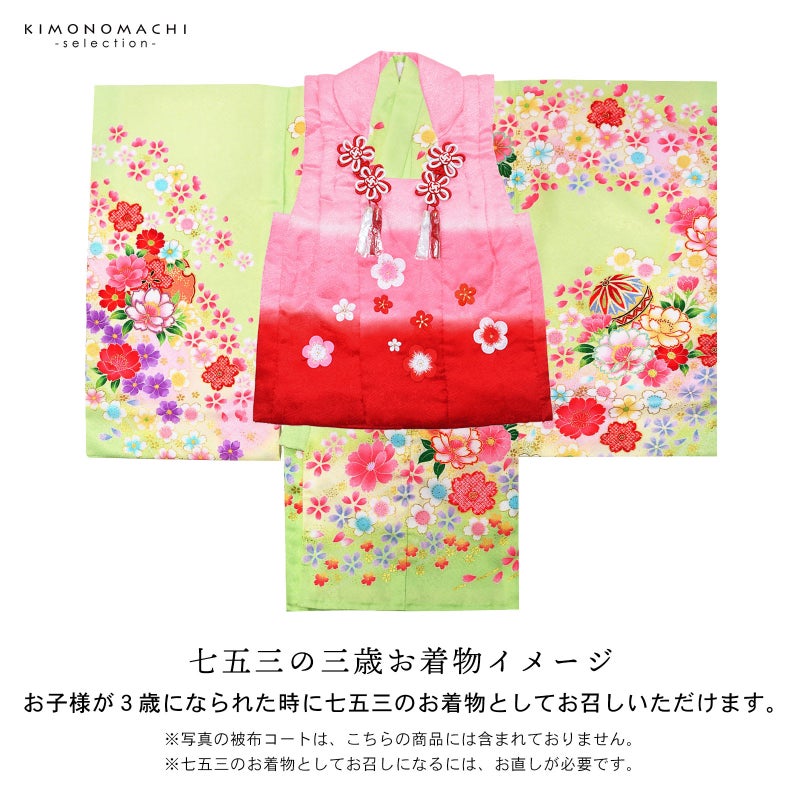 また、お子様が3歳になられた時に七五三のお着物としてもお召しいただけます。お直しが必要になりますので、別途お申込みください。