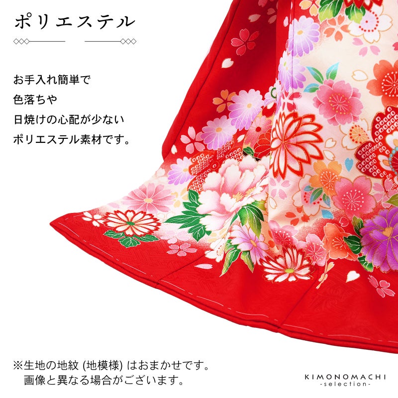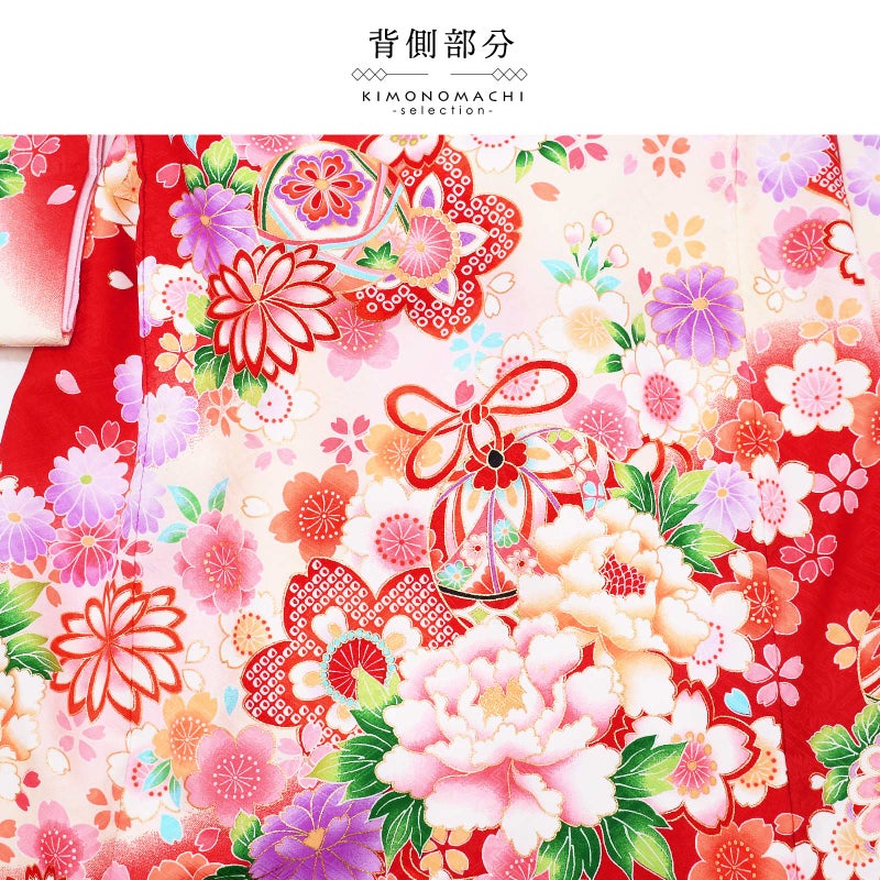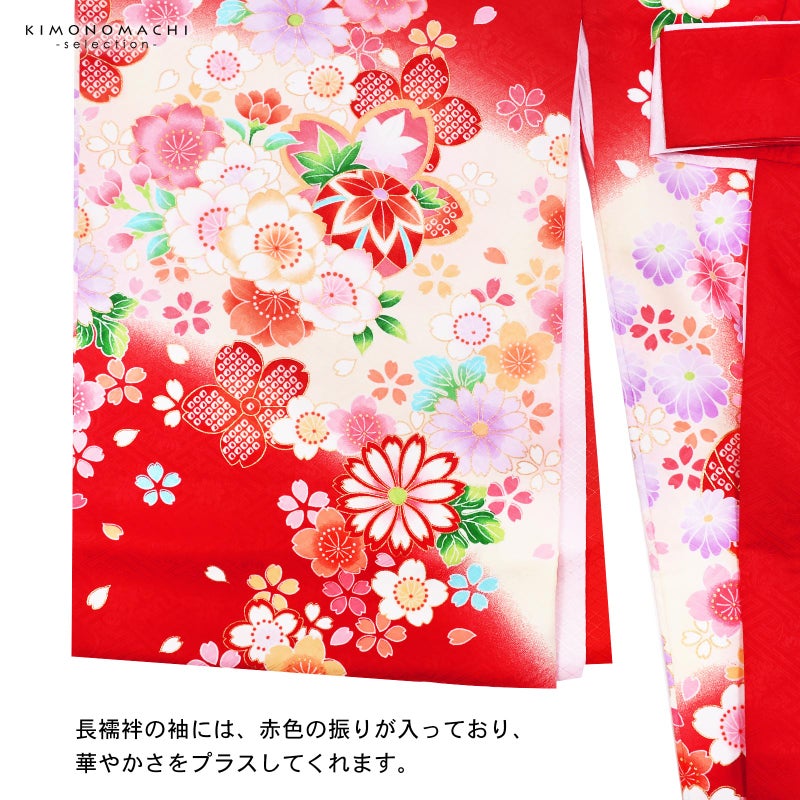 高級感がありつつも、女の子らしく可愛らしい雰囲気。美しい発色の生地に美しい模様。長襦袢の中に赤色の振りが入っており、華やかさをプラスしてくれます。細部に至るまで、こだわったお品です。