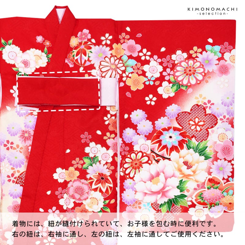 着物には紐が縫い付けられていて、お子様を包む時に便利です。右の紐は右袖に通し、左の紐は左袖に通してご使用ください。