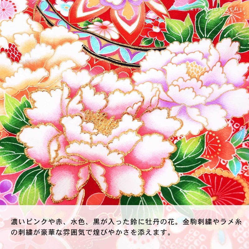 【色柄】深い赤の地に斜めに入った淡いピンクや淡いクリーム色のぼかし。濃いピンクや赤、水色、黒が入った鈴に牡丹の花。金駒刺繍やラメ糸の刺繍が豪華な雰囲気。白や赤、緑、薄紫、ピンク、淡い黄色の桜や菊の花紋、ポイントに金彩。襦袢はごく淡いピンク。振りは赤。