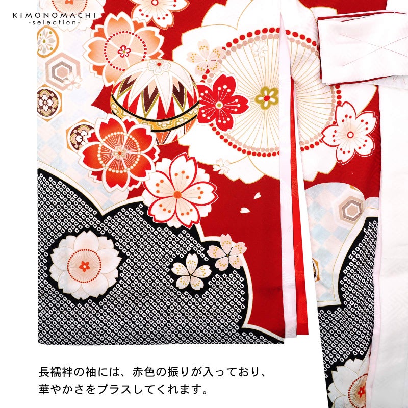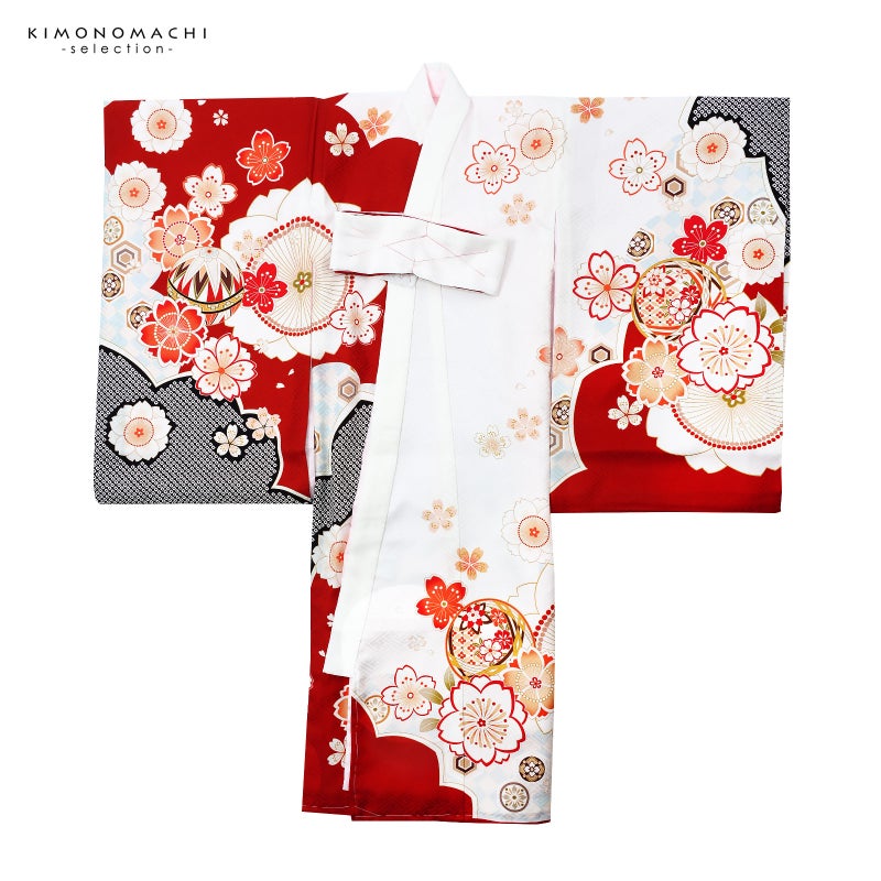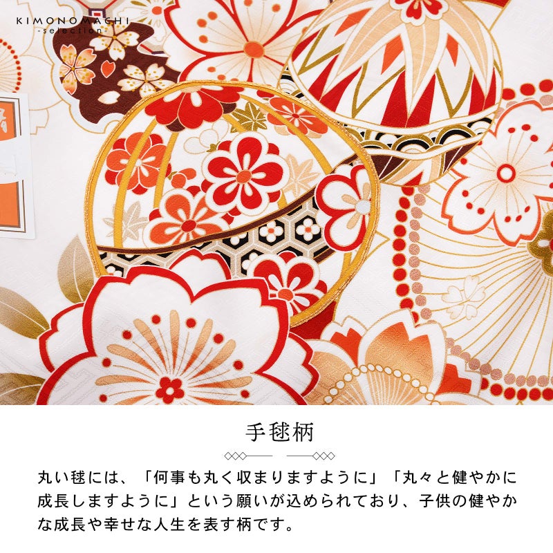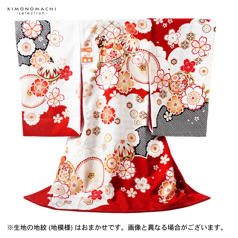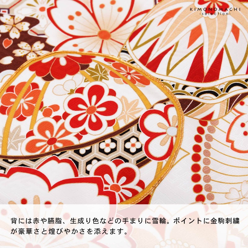 【色柄】紗綾形の地模様のある地。オフホワイトに深い赤で大きく雲、桜の形取り、その中に薄水色の市松や黒の鹿の子が配されています。背には赤や臙脂、生成り色などの手まりに雪輪。ポイントに金駒刺繍。赤や淡い橙、浅い抹茶色で大小さまざまな桜花が散らされています。襦袢は薄ピンク。袖の振りは赤。