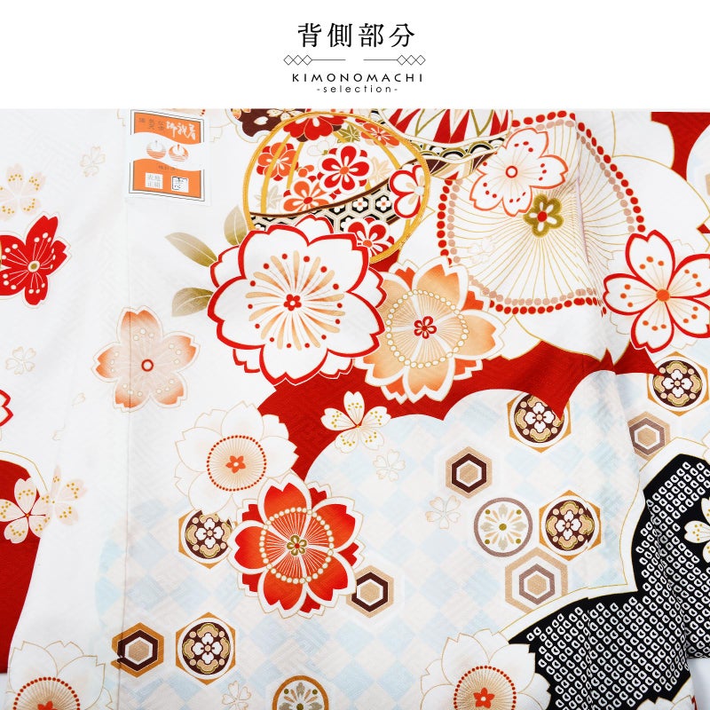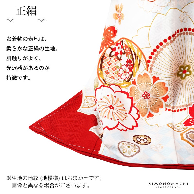 高級感がありつつも、女の子らしく可愛らしい雰囲気。絹特有の柔らかな光沢、美しい発色の生地に美しい模様。長襦袢の中に赤色の振りが入っており、華やかさをプラスしてくれます。細部に至るまで、こだわったお品です。