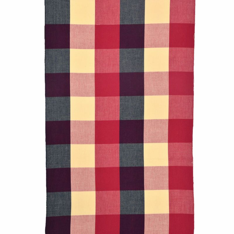 淡いたまご色、ピンクみの赤紫色、浅い紺色を重ねた約6~7cm角ほどのブロックチェック。格子の重なる部分が深い色となっており、しっとりとした奥行を感じさせます。