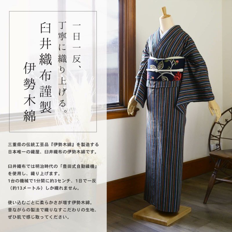 着物は単衣(ひとえ)仕立てですが、伊勢木綿は保湿・通気性にも優れているので、盛夏や真冬を除いて通年ご着用いただけます。
