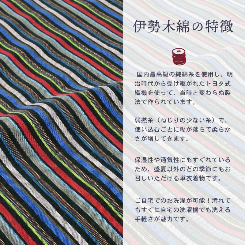やわらかく、どこかぬくもりが感じられる「伊勢木綿」のお仕立て上がり単衣着物 伊勢木綿 洗える着物 単品「縞黒×青×赤」お仕立て上がり 木綿きもの 日本製 三重県 伝統工芸品 単衣 綿 カジュアル チェック 小紋 レディース キモノ kimono【メール便不可】