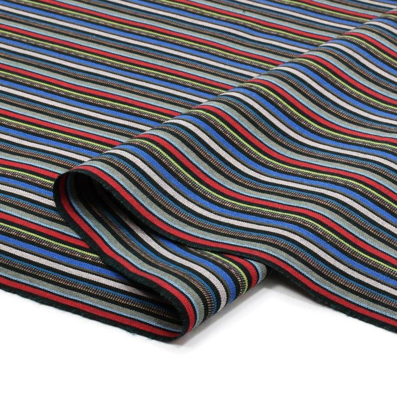【色柄】黒に青、落ち着いた赤、黄緑色、薄橙色、ごく細かな黄色などのランダムな縦縞。中性的な印象のストライプです。