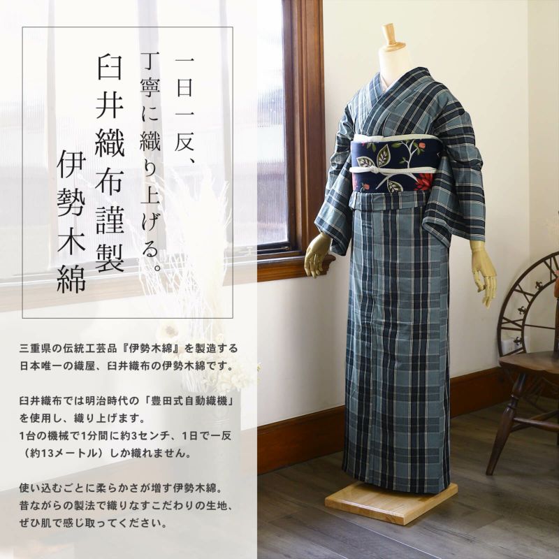 伊勢木綿 洗える着物 単品「重ね格子 シャドウブルー×ネイビー」お仕立て上がり 木綿きもの 日本製 三重県 伝統工芸品 単衣 綿 カジュアル チェック 小紋 レディース キモノ kimono