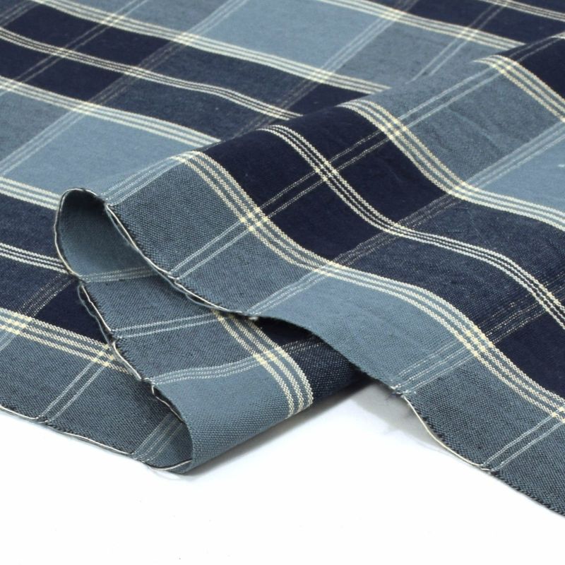 【色柄】シャドウブルーにネイビーの縞、合間に白の細縞。横段に淡い同色を重ねたチェック。大人っぽく中性的な格子です。