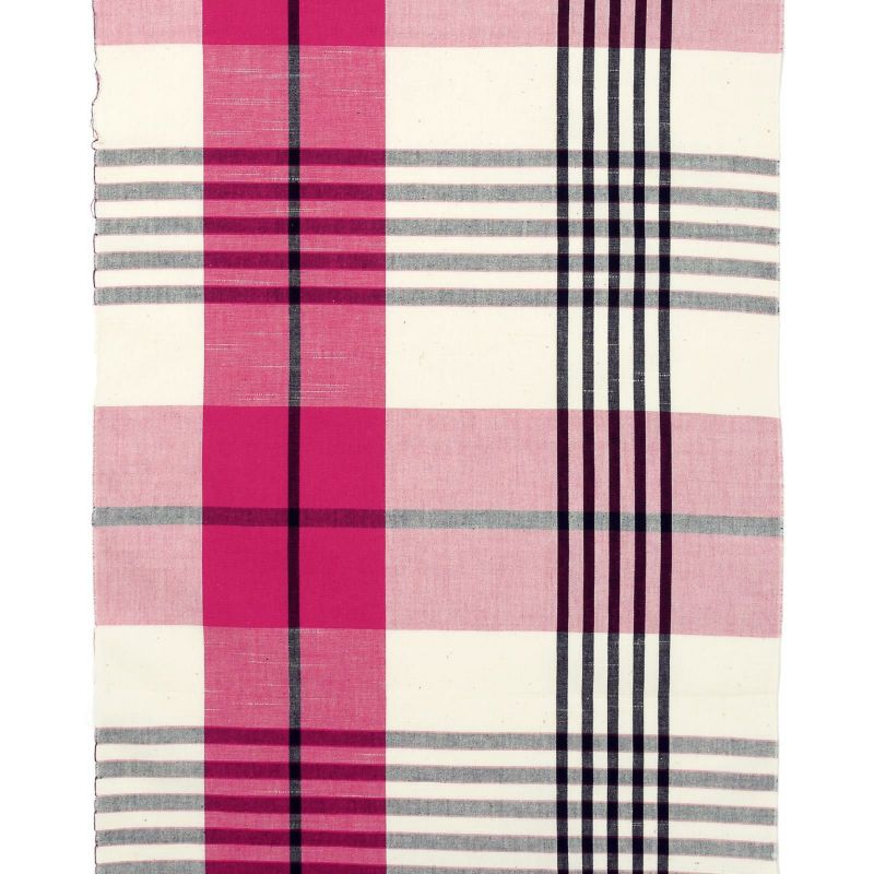 【色柄】生成色みの白にやや鈍い赤紫色の格子。紺の五本縞と一本縞を重ねた格子。はっきりとした色彩がモダンで可愛らしい印象です。