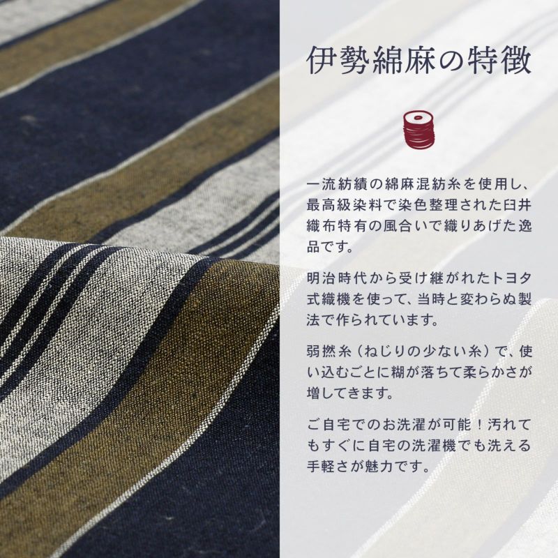 一流紡績の綿麻混紡糸を使用し、最高級染料で染色整理された臼井織布特有の風合いで織りあげた逸品です。