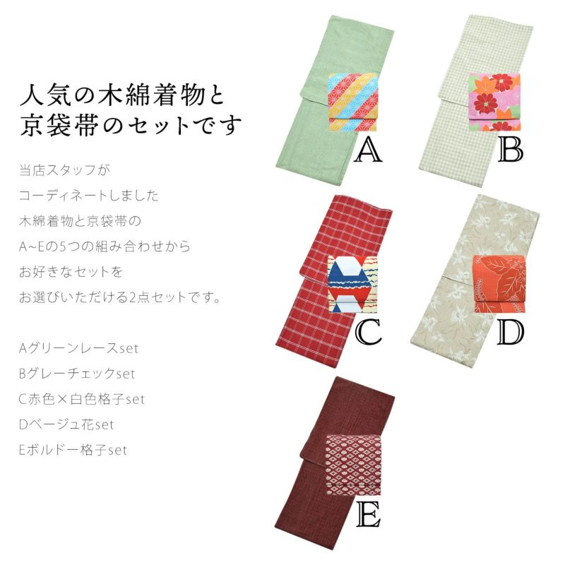 当店スタッフがコーディネートしました木綿着物と京袋帯のA~Eの5つの組み合わせからお好きなセットをお選びいただけます。