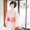 帯:白地の全面に、桜と楓が重なり合うようにして敷き詰められた柄が賑やか。オレンジ・黄緑・ピンク・赤とカラフルな色をたっぷり使った帯です。