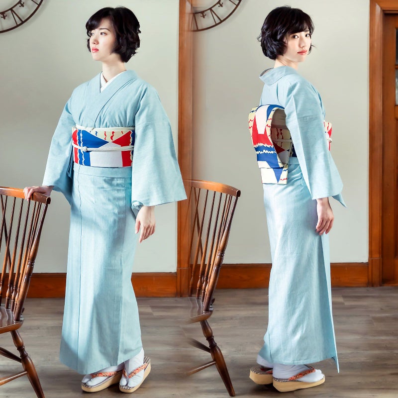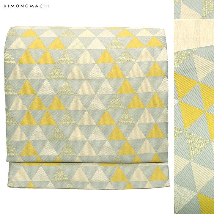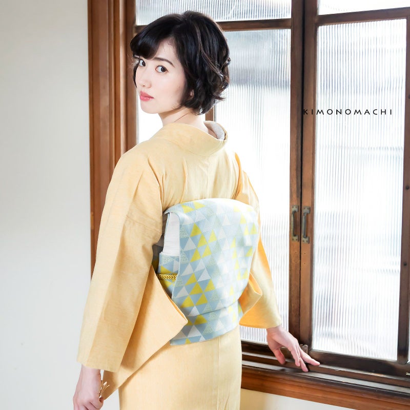 帯:灰色みのある淡い水色の地に、やや灰みの明るい黄色を中心とした鱗模様の帯。地の色と模様の三角形が交互に構成されたうろこ文様。シンプルな連続模様ですが、白や淡いベージュ、淡い緑色など色や織りに変化をつけており、単調な印象になりません。