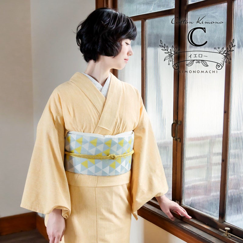 着物:少し赤みがかった杢イエロー。どんな帯にも合わせやすい万能カラー。