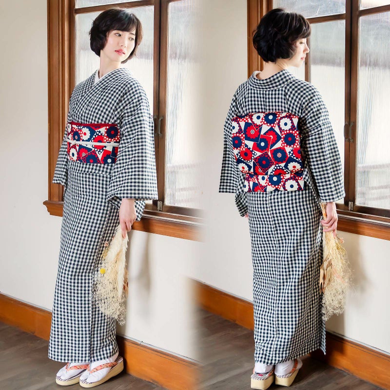 着物:黒のチェック柄は着こなしやすさ抜群。ポップなコーディネートもシックなコーディネートもおしゃれに決まります。