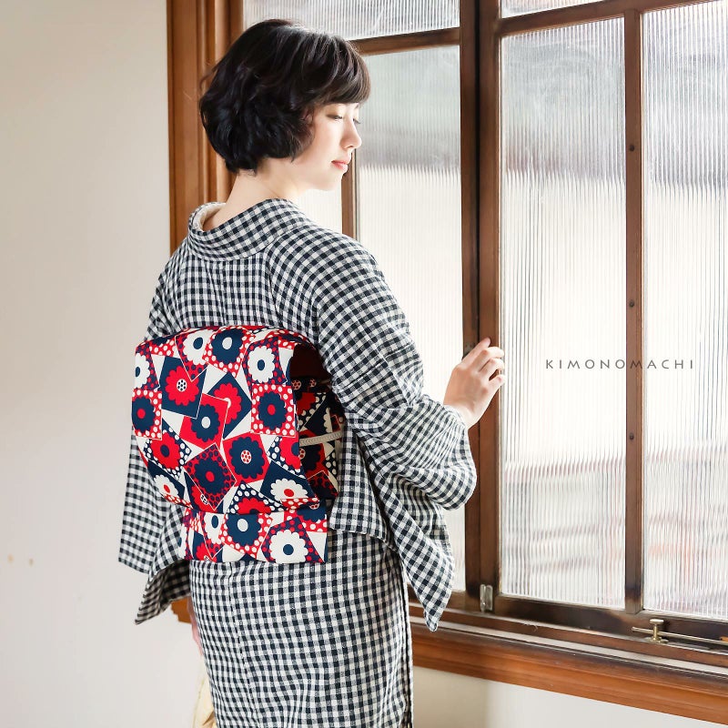 帯:柔らかな白色地に、ネイビー、赤色の色使いのレトロな雰囲気のお花模様。