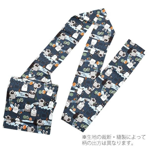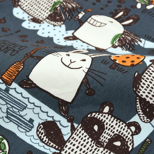 【カラー】青みの濃いグレー地に、うさぎ、狸などのかちかち山を連想できるようなポップな模様。