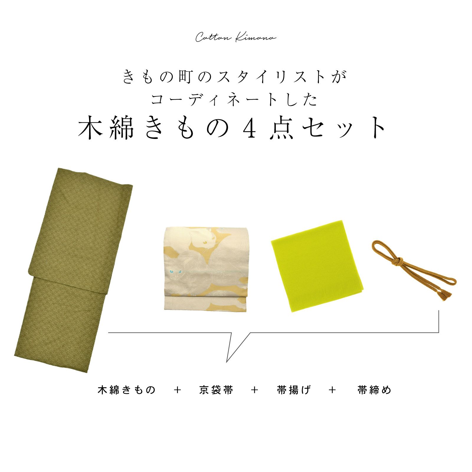 京都きもの町オリジナルの木綿着物と京袋帯に帯揚げと帯締めがついた4点セットです。