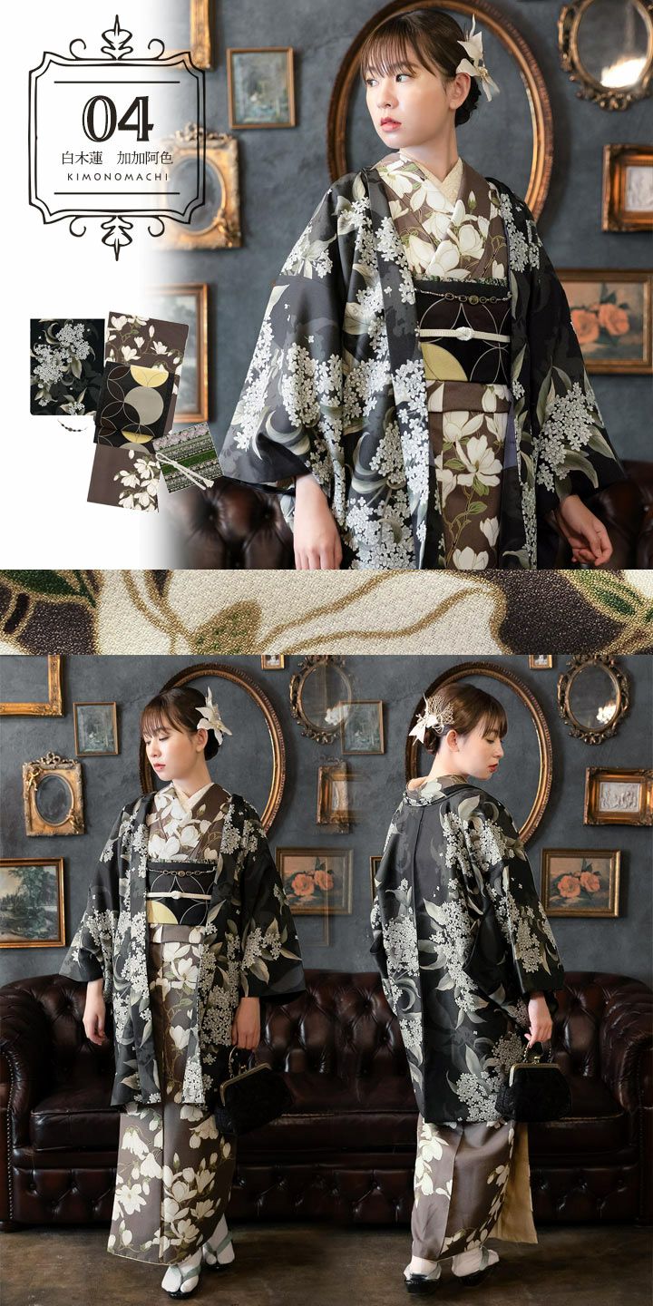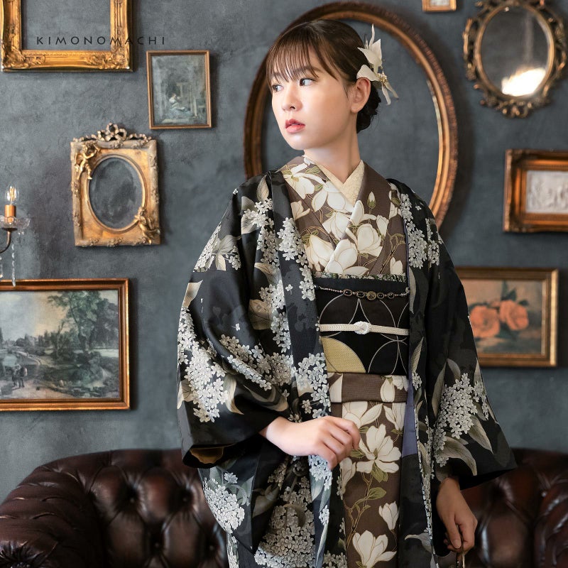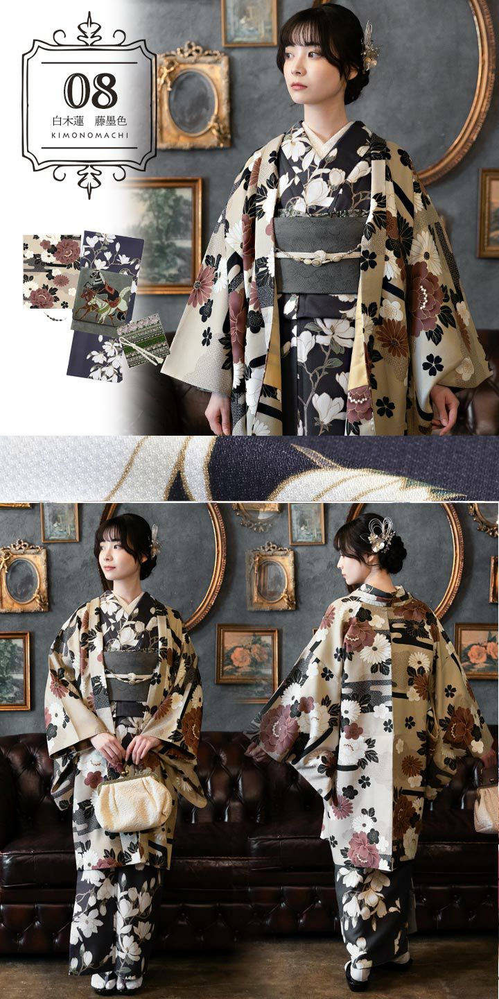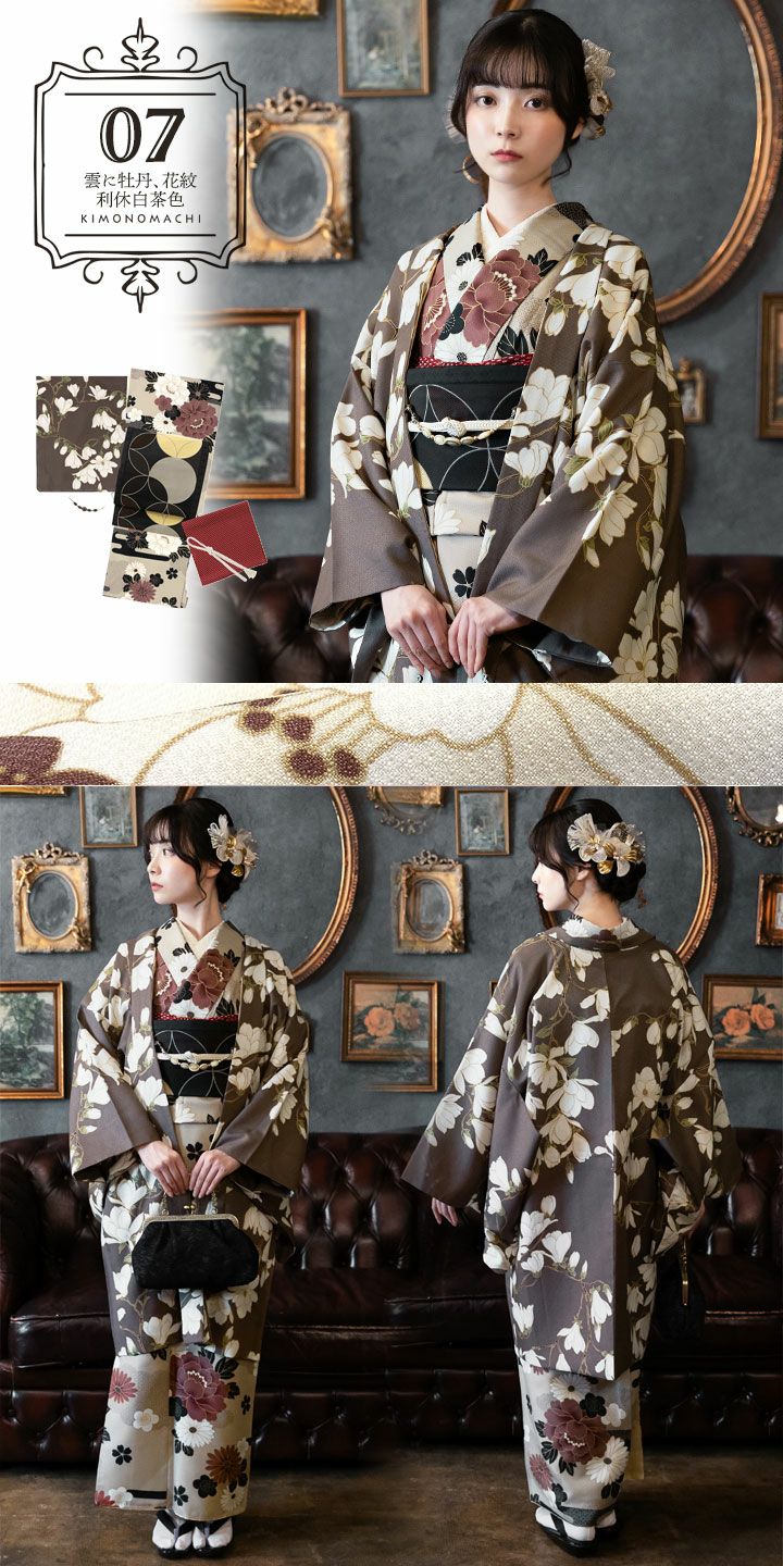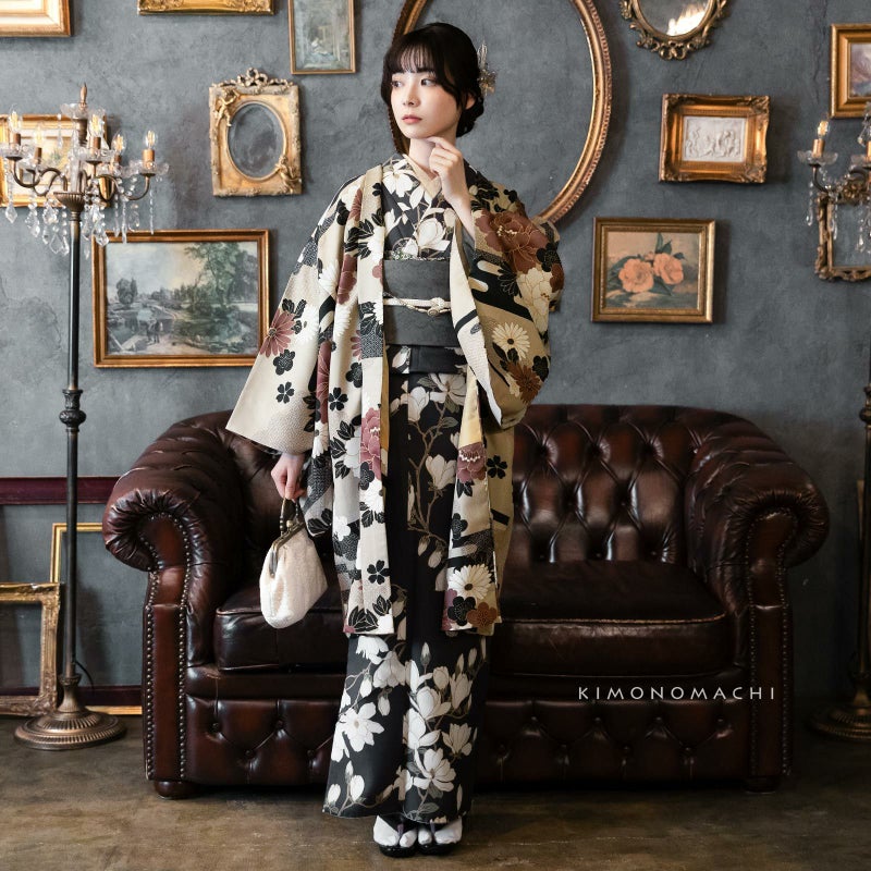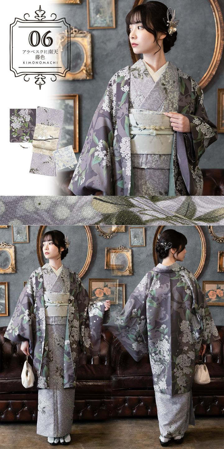 京都きもの町オリジナルブランド「KIMONOMACHI」の袷着物と京袋帯と羽織に、帯揚げと帯締め、羽織紐がセットになった、カジュアルな小紋の袷着物セットです。春・秋・冬にお召しいただけます。