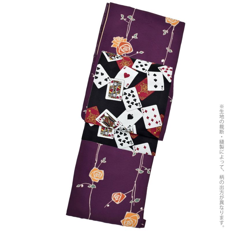 京袋帯:黒地にトランプのカードを散らしたデザイン。白地に各種のスートの数札、絵札の表情まで細やかに表現されています。臙脂色に金茶のアラベスク模様の裏面がアクセント。