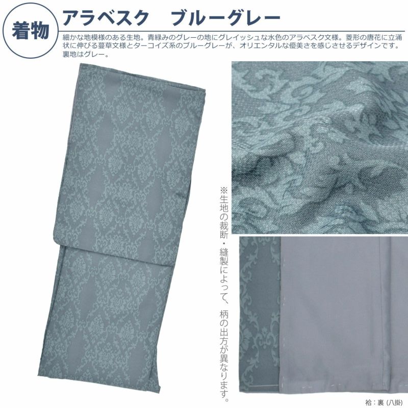 袷着物:細かな地模様のある生地。青緑みのグレーの地にグレイッシュな水色のアラベスク文様。菱形の唐花に立涌状に伸びる蔓草文様とターコイズ系のブルーグレーが、オリエンタルな優美さを感じさせるデザインです。裏地はグレー。