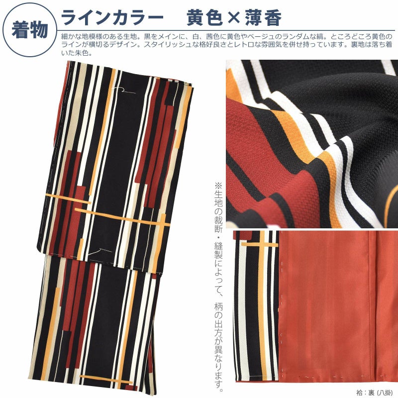 袷着物:細かな地模様のある生地。黒をメインに、白、茜色に黄色やベージュのランダムな縞。ところどころ黄色のラインが横切るデザイン。スタイリッシュな格好良さとレトロな雰囲気を併せ持っています。裏地は落ち着いた朱色。
