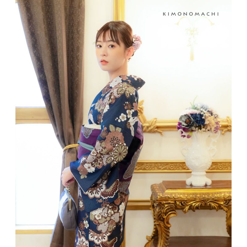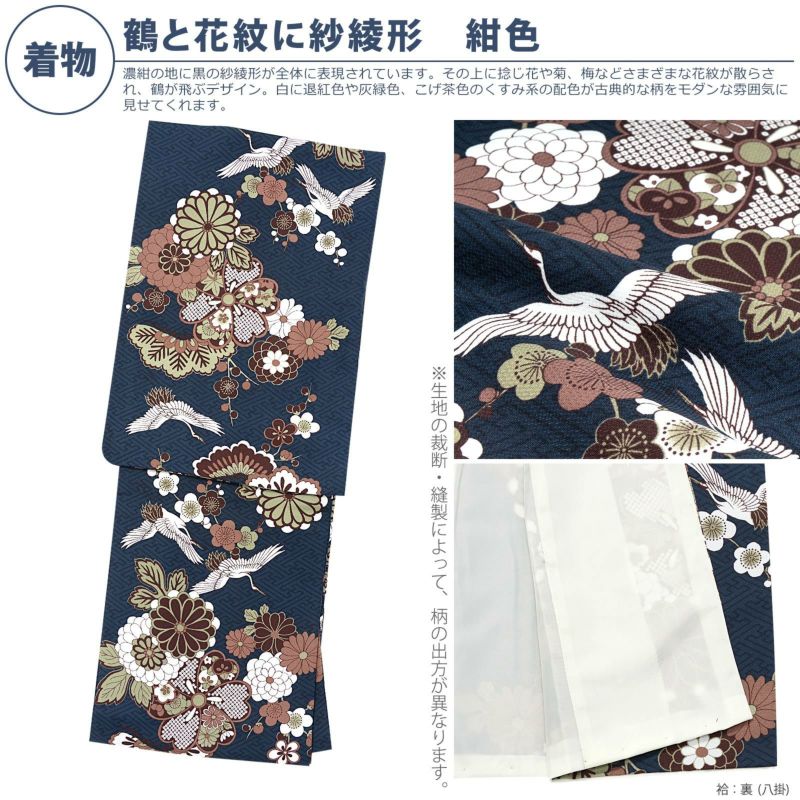 着物:濃紺の地に黒の紗綾形が全体に表現されています。その上に捻じ花や菊、梅などさまざまな花紋が散らされ、鶴が飛ぶデザイン。白に退紅色や灰緑色、こげ茶色のくすみ系の配色が古典的な柄をモダンな雰囲気に見せてくれます。裏はオフホワイト。