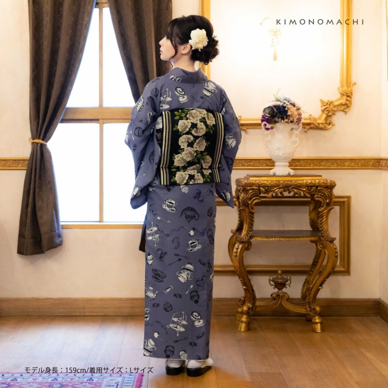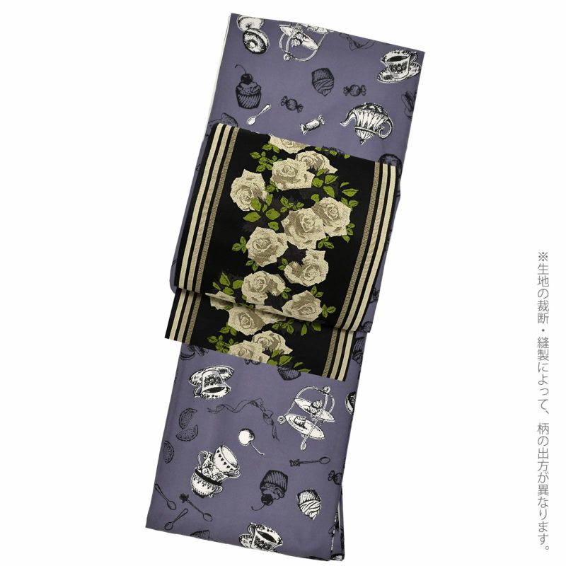 着物:細かな地模様のある生地。グレイッシュな鈍い青紫色の地に、黒の線で表現された茶器やお菓子、フルーツなどアフタヌーンティーの品々を散らした模様。部分的に白く抜いた柄が際立って見えます。ペン画調のカップやケーキ、マカロン、レモンなど見ているだけでお茶会の楽しさをイメージさせるデザインです。裏地は白。