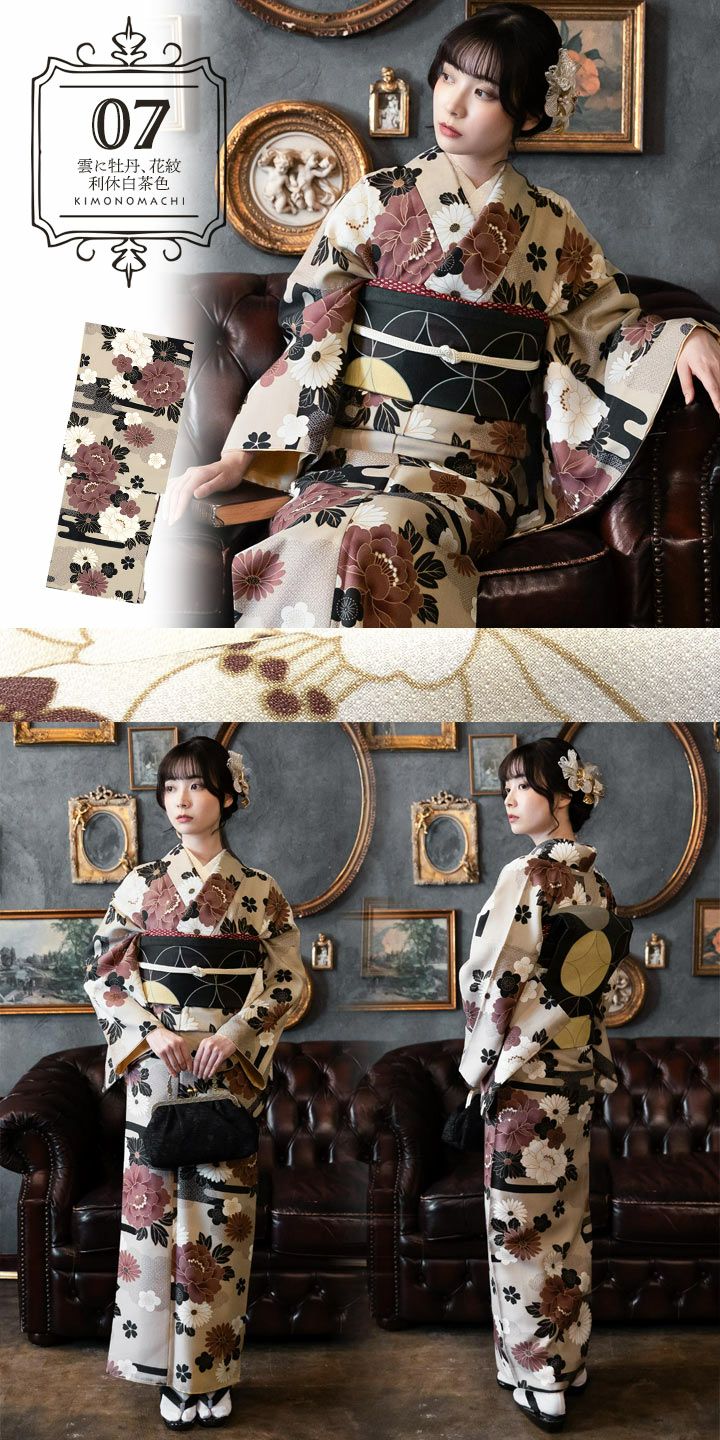 07.雲に牡丹、花紋 利休白茶色