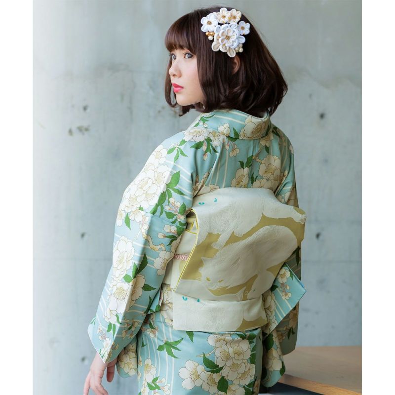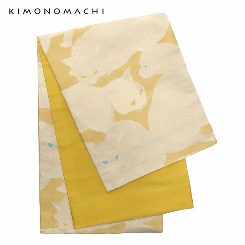 ややグレイッシュな淡い黄色地に、ターコイズブルーとイエローの目を光らせる白猫の姿。光の加減で浮き上がるような艶のある毛並みまで繊細に表現されています。日向の光の中で思い思いに過ごす猫たちの瞬間の表情を切り取ったかのような、リアルな姿が魅力的です。猫好きさんへ自信を持っておすすめする、美しい猫の帯です。