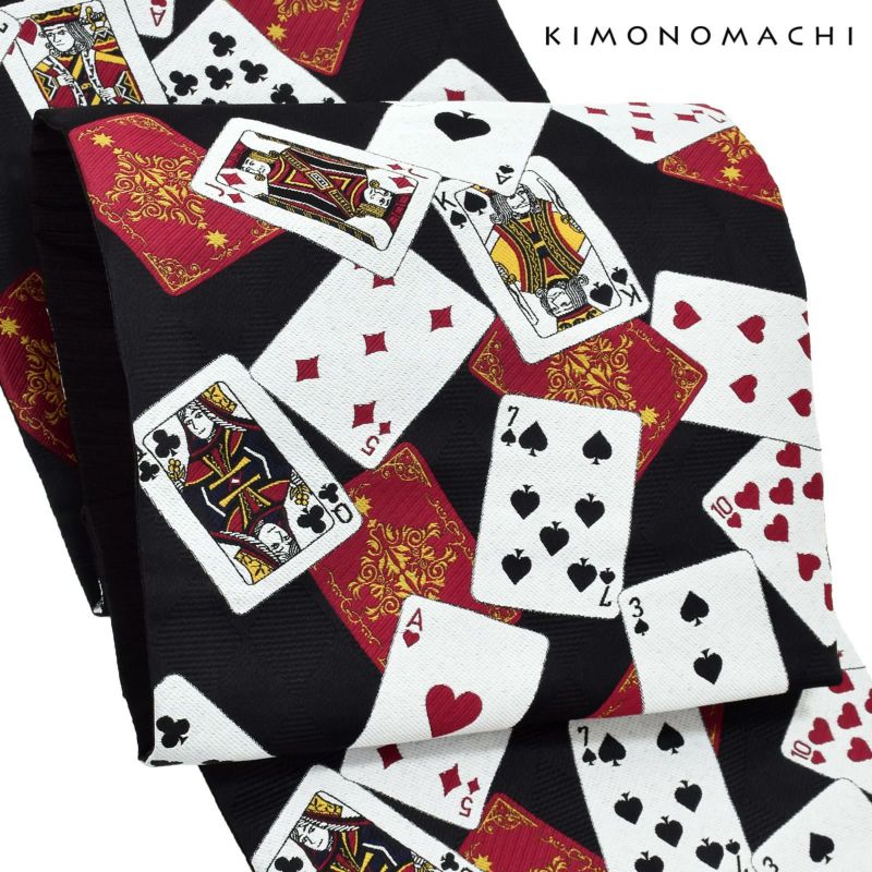 【色柄】黒地にトランプのカードを散らしたデザイン。白地に各種のスートの数札、絵札の表情まで細やかに表現されています。臙脂色に金茶のアラベスク模様の裏面がアクセント。