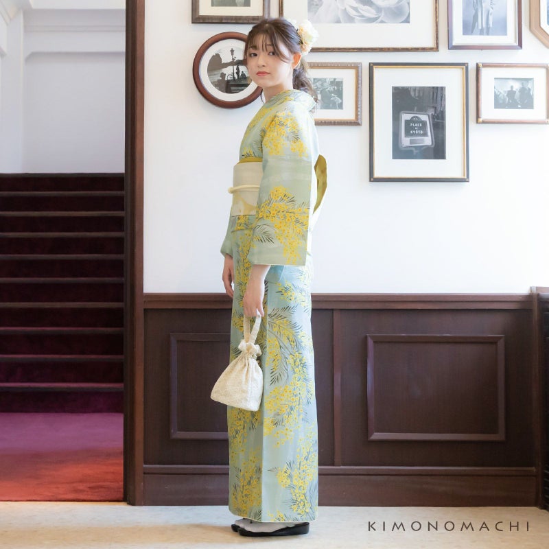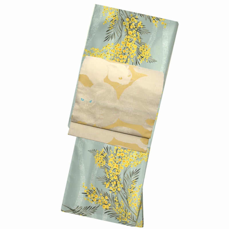 袷着物:細かな地模様のある生地。ややグレイッシュな淡いブルーグリーンの地に白くかすれた立涌文様。その上にふっさりと花をつけたミモザの模様。黄色に鶸色や金茶色のぼかしの入った丸い花々、深緑色の羽根状の葉。ミントカラーの軽やかさと、模様の曲線的なやわらかさが魅力的なデザインです。裏地は白。
