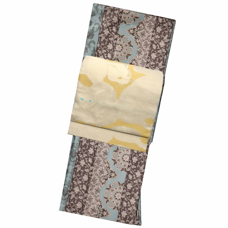 京袋帯:ややグレイッシュな淡い黄色地に、ターコイズブルーとイエローの目を光らせる白猫の姿。光の加減で浮き上がるような艶のある毛並みまで繊細に表現されています。日向の光の中で思い思いに過ごす猫たちの瞬間の表情を切り取ったかのような、リアルな姿が魅力的です。猫好きさんへ自信を持っておすすめする、美しい猫の帯です。