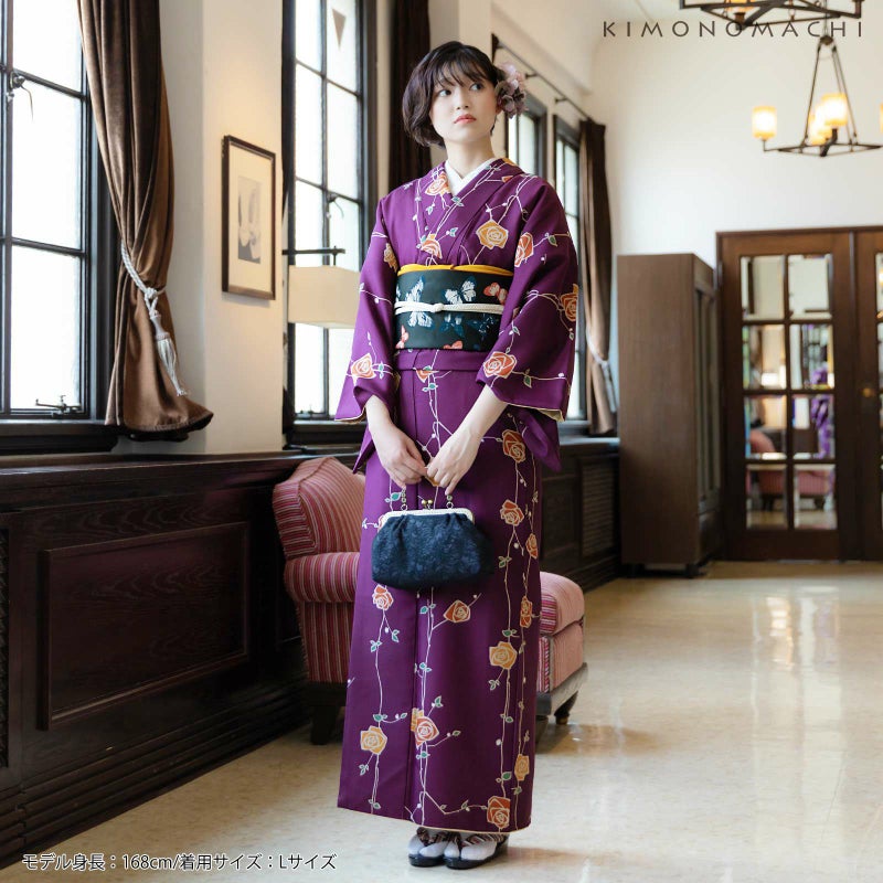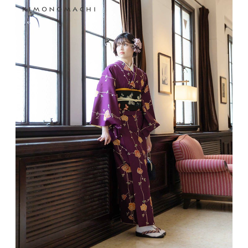 袷着物:細かな地模様のある生地。深い紫色の地に、ごく淡いベージュの輪郭線、浅い橙色や赤茶の花、深い緑の葉のバラの花。やや直線的なデザインと深い色がレトロなかわいらしさを感じさせます。裏地はベージュ。