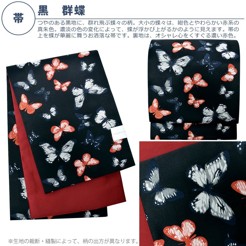 京袋帯:つやのある黒地に、群れ飛ぶ蝶々の柄。大小の蝶々は、紺色とやわらかい赤系の真朱色。濃淡の色の変化によって、蝶が浮かび上がるかのように見えます。帯の上を蝶が華麗に舞うお洒落な帯です。裏地は、オシャレ心をくすぐる濃い赤色。