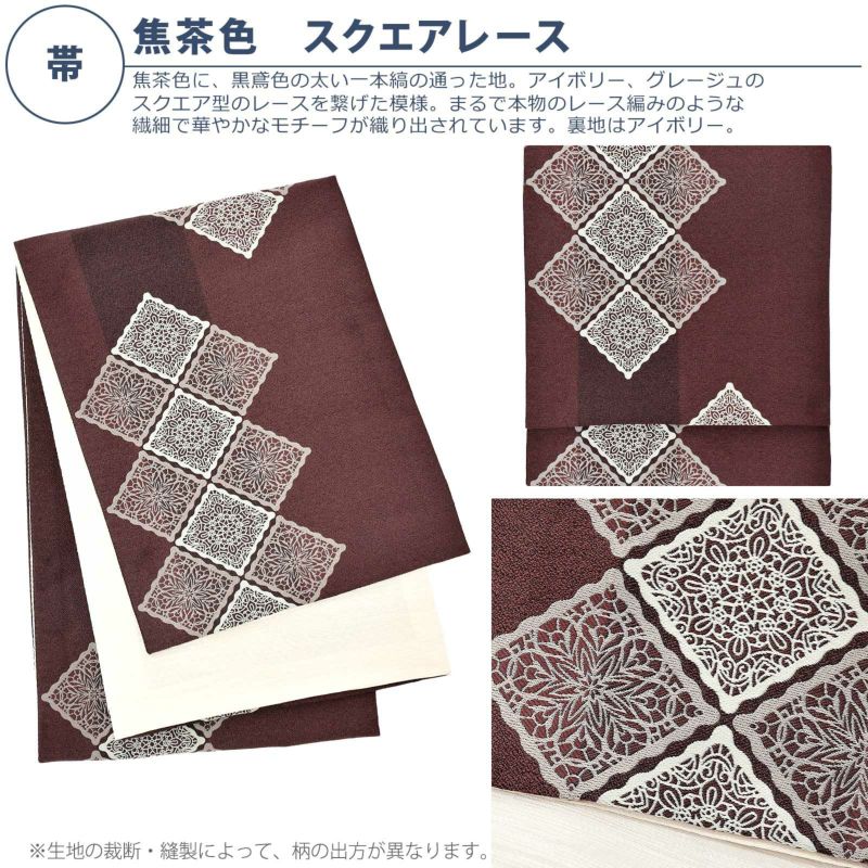 京袋帯:焦茶色に、黒鳶色の太い一本縞の通った地。アイボリー、グレージュのスクエア型のレースを繋げた模様。まるで本物のレース編みのような繊細で華やかなモチーフが織り出されています。裏地はアイボリー。
