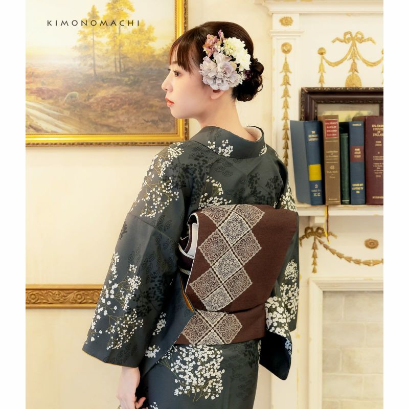 着物:墨色の地に黒の破れ青海波が表現されています。白い花に深い黄緑の茎のカスミソウに黒のシルエットを添えたデザイン。シックな配色と繊細な可愛らしさが魅力です。裏は山吹茶。