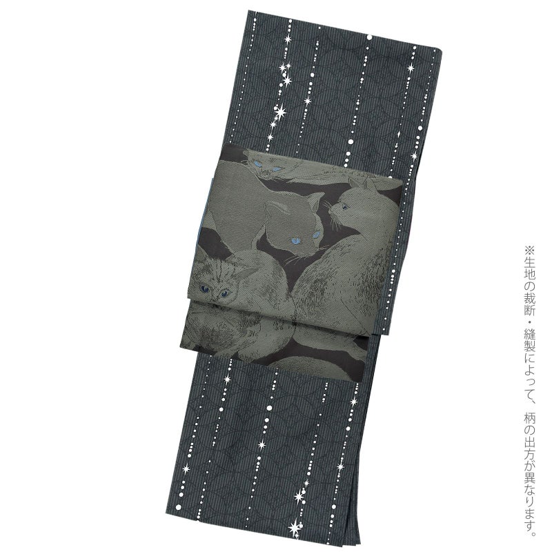京袋帯:チャコールグレーの地に、スモークブルーとネイビーの目を光らせる灰猫の姿。光の加減で浮き上がるようなアイビーグレーの毛並みが繊細に表現されています。夕闇になる前の、空と地面が同じ色に溶けあう中にほの見える猫たちの表情、リアルな姿が魅力的。猫好きさんへ自信を持っておすすめする、美しい猫の帯です。裏地は深いスモークブルー。