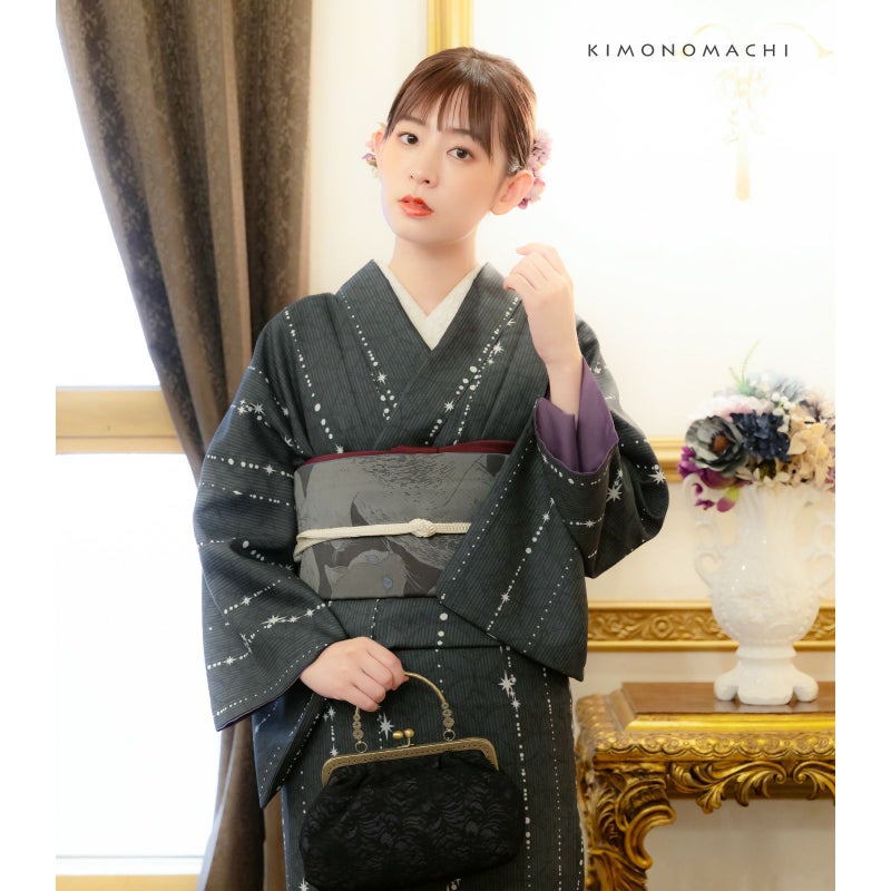 着物:墨色の地に黒の花七宝文様と細かな縞が全体に表現されています。その上に縦に配置された白の大小のドットや星。シックな配色とキラキラと零れ落ちる星くずのデザインがすっきりとした印象です。裏は紫。