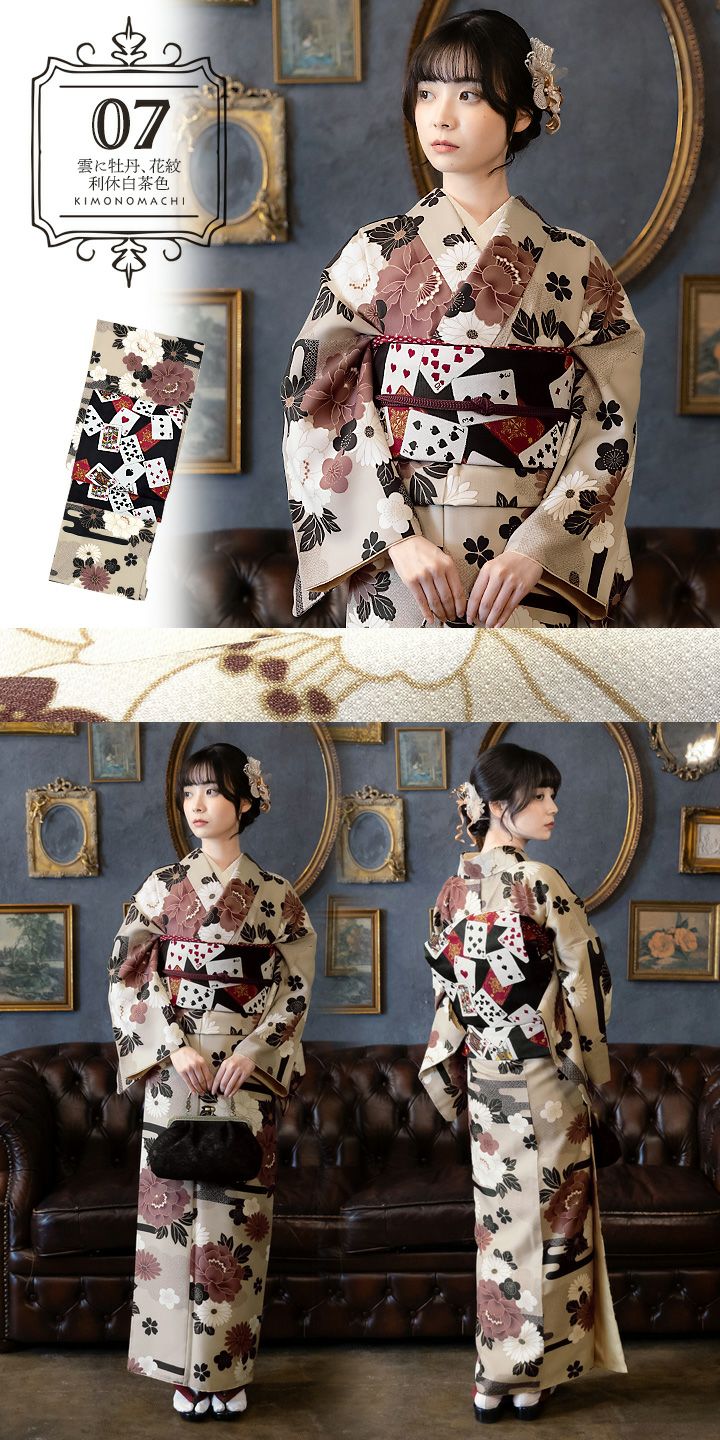 袷着物:生成り色の地に、黒鳶色のエ霞、濃いベージュの鹿の子の雲、その上に牡丹を中心とした梅、菊、桜などのさまざまな花紋。深い赤、白、淡いベージュなどに黒鳶色の配色で、可愛らしさと渋さのある古典的な印象のデザインです。裏地は白。