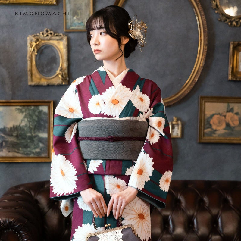 袷着物:細かな地模様のある生地。落ち着いた赤紫色の地に深い青緑の矢羽根、白に淡いベージュのぼかしの大小の菊の花。深い色合いとアンティーク調の大胆な柄行が魅力です。裏地は浅いターコイズ。