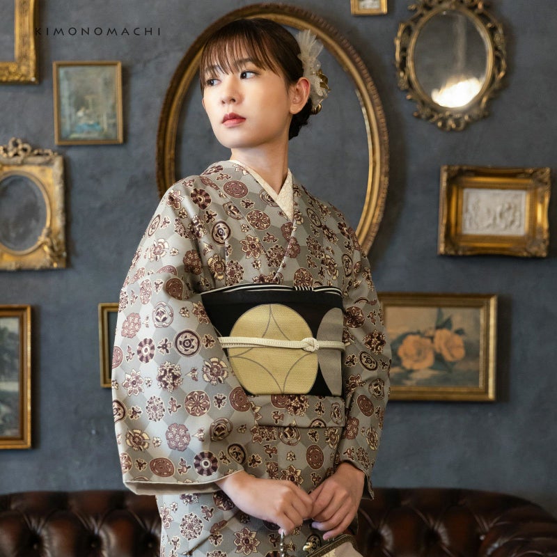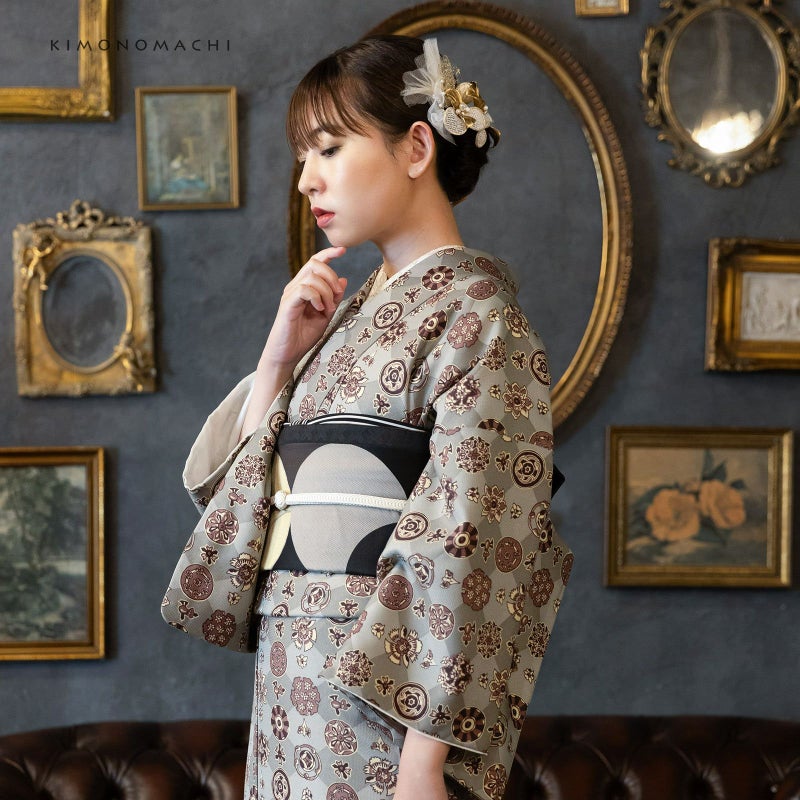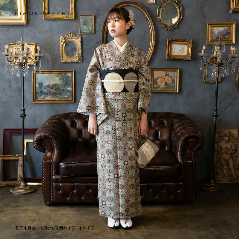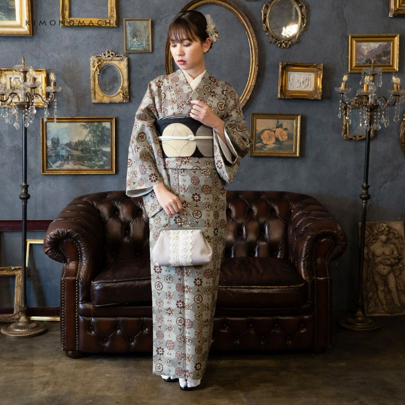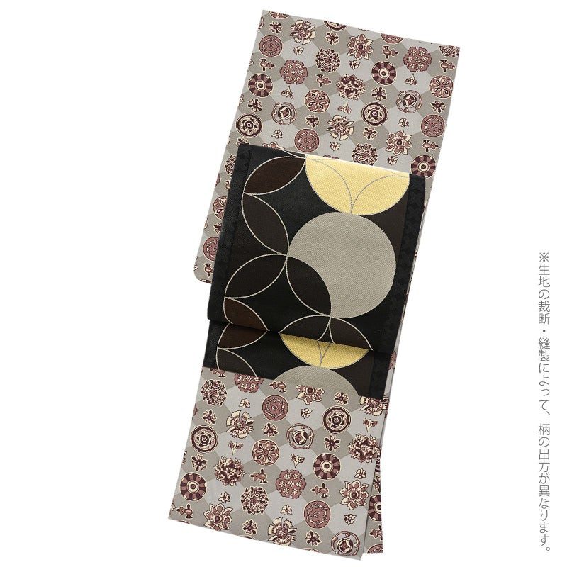 袷着物:グレーとベージュグレーの菱形を並べた地。その上に退紅色、こげ茶、生成り色の更紗の丸紋や小花紋が等間隔に配置されています。レトロな小紋を現代的なくすみカラーでシックにまとめたデザインです。裏はオフホワイト。
