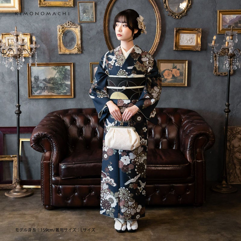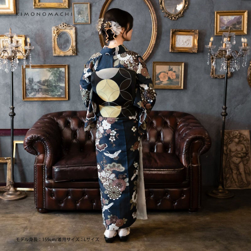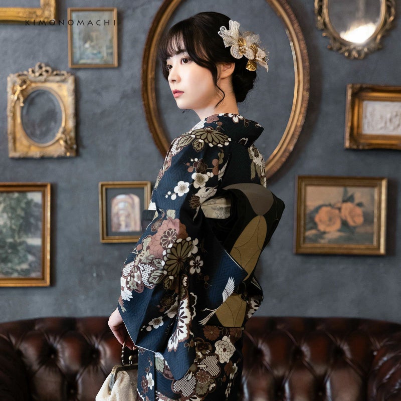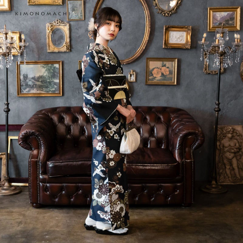 袷着物:濃紺の地に黒の紗綾形が全体に表現されています。その上に捻じ花や菊、梅などさまざまな花紋が散らされ、鶴が飛ぶデザイン。白に退紅色や灰緑色、こげ茶色のくすみ系の配色が古典的な柄をモダンな雰囲気に見せてくれます。裏はオフホワイト。