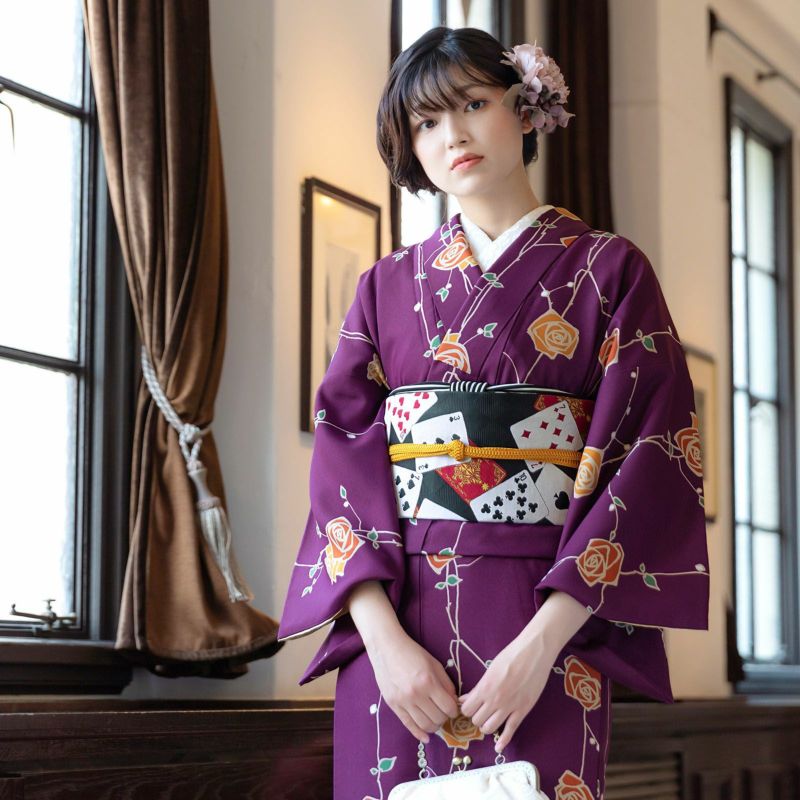京袋帯:黒地にトランプのカードを散らしたデザイン。白地に各種のスートの数札、絵札の表情まで細やかに表現されています。臙脂色に金茶のアラベスク模様の裏面がアクセント。