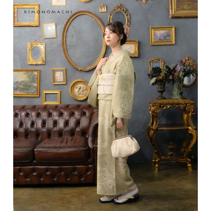 着物:浅い緑みのベージュの地に灰黄緑色の破れ青海波が表現されています。白い花に灰黄緑の茎のカスミソウに灰黄緑のシルエットを添えたデザイン。落ち着いた優しい色合いが大人の可愛らしさを感じさせます。裏はオフホワイト。